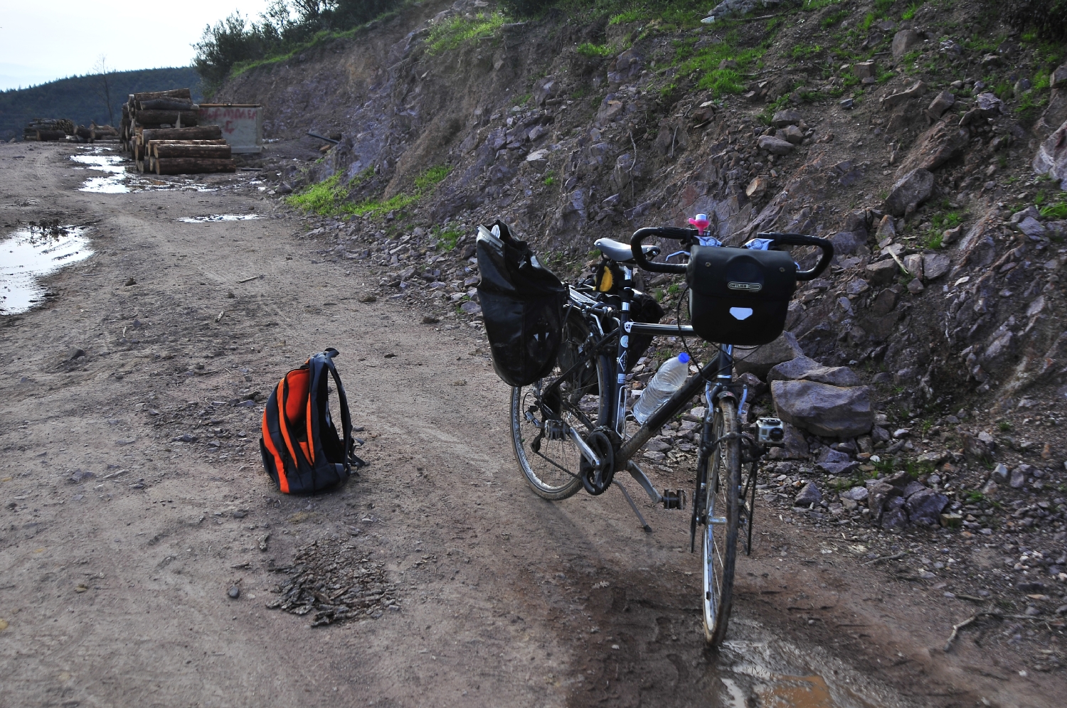 %60 civarı eğimle boğuşurken. Orada ayakta zor duruyordum. Üstelik bisikleti nasıl yukarı çıkartacağım ki? Bir kaç metre daha ittirip bisikletini tek başına çıkarabilen Olgun' u çağırıyorum. Kollarım bacaklarım kadar güçlü değil. Ağır kaldırma konusunda iyi değilim. Mecburen destek aldım. Fotoğraf: Olgun Şenel